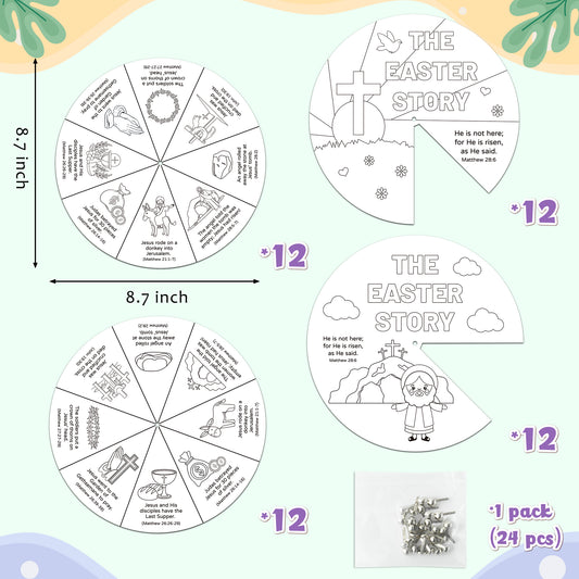 COcnny 24 Sets The Easter Story Craft, Color Your Own Easter Jesus Wheel for Kids, Religious Bible Coloring Cards DIY Crafts Art Game for Sunday School Christian Classroom Home Activities VBS Supplies