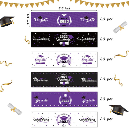COcnny 120pcs Graduation Water Bottle Labels, Graduation Decoration Sticker Class of 2023 Congrats Grad Party Supplies, Bottle Wrapper Label Decor for High School College Graduate Celebration (Purple)