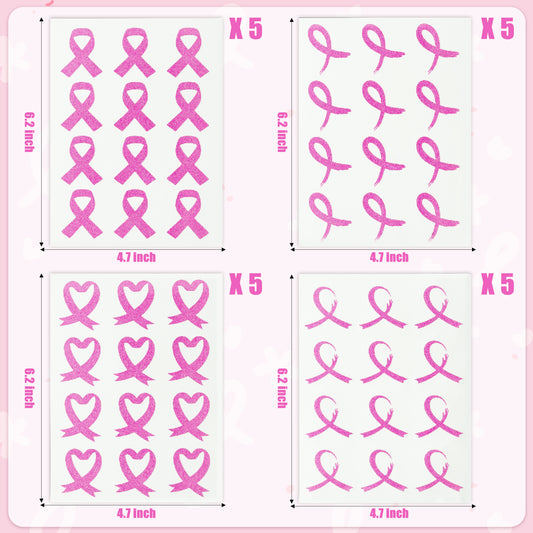 COcnny 20pcs Breast Cancer Awareness Tattoo Sticker, Glitter Pink Breast Cancer Decals Items Decorations, Tramp Stamp Ribbon Temporary Tattoos Accessories Favor for Women Girl Hand Face Body (4 Style)